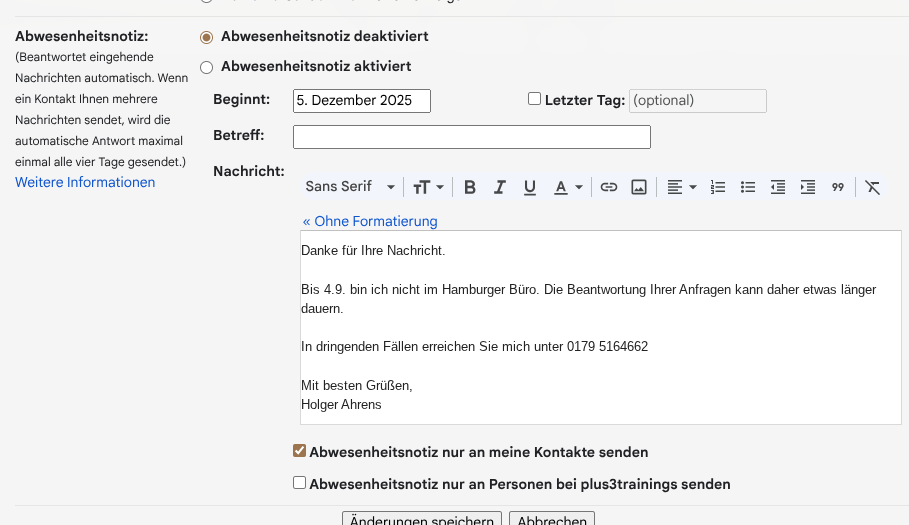 Übertreiben Sie es nicht bei der Formatierung des Textes! Wichtige Angaben kann man aber durchaus einmal fett machen und Links auch mit einer URL versehen. Mittels der zwei Optionen am Ende kann man den Empfängerkreis der Abwesenheitsnotiz einschränken. Nicht jeder muss via Google Mail wissen, dass man gerade im Urlaub oder krank ist!
